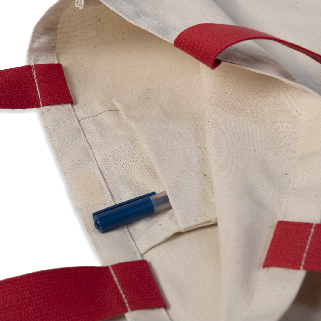 Sacoșă reutilizabilă din bumbac 100%, netratat, nevopsit și neînălbit. Sacoșa are un buzunar interior și se închide cu arici.